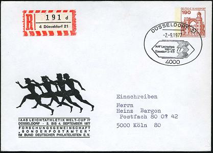 6254 | 18 € | 4000 Düsseldorf Sonderstempel : 4000 DÜSSELDORF 21/ IAAF Leichtathl./ Welt-Cup 77 1977 (2.9.) SSt auf PU 190 Pf.: IAAF-Leichtathletik-Welt-Cup (Mi.PU 120/2) Abb.: antike (Marathon)-Läufer + RZ: 4 Düsseldorf 21/d, klar gest. Inl.-R-Bf.! (Bo.536) | ![]() | |