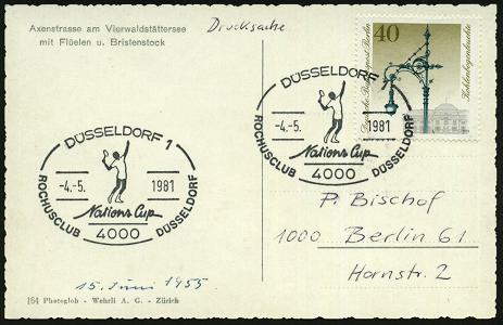 6255 | 11 € | 4000 Düsseldorf Sonderstempel : 4000 DÜSSELDORF 1/ Nations Cup/ ROCHUSCLUB.. 1981 (4.5.) SSt (Tennispieler beim Aufschlag) klar gest. Inl.-Karte | ![]() | |