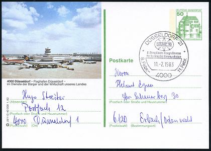 6256 | 15 € | 4000 Düsseldorf Sonderstempel : 4000 DÜSSELDORF 21/ ONLINE´83/ 6.Europ.Kongreßmesse/ für Techn.Kommunikation 1983 (11.2.) SSt (Logo)auf ortsgl. BiP 50 Pf. Burgen: 4000 Düsseldorf - Flughafen.. (Mi.P 134) seltene Kombination! | ![]() | |