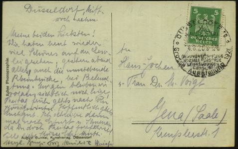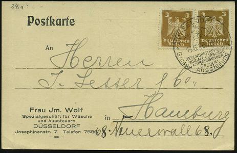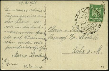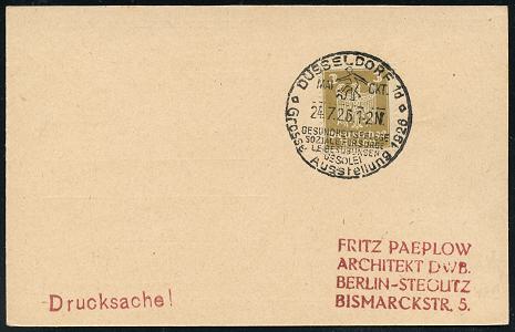 6203 | 20 € | 4000 Düsseldorf Sonderstempel : DÜSSELDORF 1c/ GESUNDHEITSPFLEGE/ ..LEIBESÜBUNGEN/ GESOLEI/ Gr.Ausstellung 1926 (29.5.) SSt mit UB "c" (Mann zertritt Schlange) klar auf s/w.-Ausstellungs-Sonder-Kt.: Gesolei mit Rheinbrücke, Bedarf (Bo.24 c) | ![]() ![]() | |
