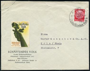 6211 | 28 € | 4000 Düsseldorf Sonderstempel : DÜSSELDORF/ d/ GROSSE REICHS-AUSSTELLUNG/ Schaffendes Volk 1937 (12.7.) SSt = Hand mit Hammer + motivgl.Ausstellungs-Vignette auf passendem Vordruck-Bf.: SCHAFFENDES VOLK, Düsseldorf Schlageterstadt.. (links oben Riß geschl.) seltene Kombination!, vergl. Kat.Nr.6452 (Bo.42 d) | ![]() | |