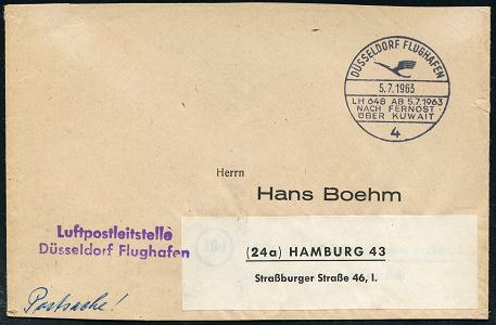 6235 | 10 € | 4000 Düsseldorf Sonderstempel : 4 DÜSSELDORF FLUGHAFEN/ LH 648 AB 5.7.1963/ NACH FERNOST/ ÜBER KUWAIT 1963 (5.7.) SSt (DLH-Logo) + viol. Abs.-2L: Luftpostleitstelle/Düsseldorf flughafen (Bf. fehlt rs. Klappe) Postdienst-Bf. (gefaltet, da Antwort-Bf.) klar gest. (Bo.201) | ![]() | |