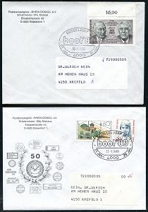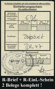 6247 | 25 € | 4000 Düsseldorf Sonderstempel : 4 DÜSSELDORF 1/ BDPh/ 20 JAHRE NEUES HANDBUCH.. 1971 (6.11.) SSt + Sonder-RZ: 4 Düsseldorf 1, 20 Jahre/Neues Handbuch d. Brief-/markenkunde im BDPh (NEZ Kat.Nr. 209 Ty.II = ohne Trennstrich, Aufl. nur 209 R-Belege!) + R-Einl.Schein kpl., Inl.-R-Bf., 2 Belege kompl.! (Bo.368) | ![]() ![]() | |