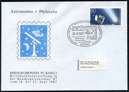6259 | 12 € | 4000 Düsseldorf Sonderstempel : 4000 DÜSSELDORF 1/ 10 Jahre Motivgruppe Astronomie.. 1987 (20.6.) SSt = Fernrohr, Mond, Saturn , klar gest. motivgl. Sonderumschlag, EF 80 Pf. Halley-Giotto-Komet | ![]() | |