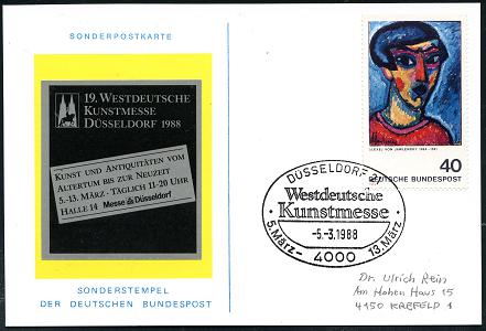 6260 | 12 € | 4000 Düsseldorf Sonderstempel : 4000 DÜSSELDORF 21/ Westdeutsche/ Kunstmesse 1988 (5.3.) SSt auf EF 40 Pf. A. von Jawlensky (Kopf in Blau) Ausst.-Sonder-Kt. (Mi.798 EF) | ![]() | |