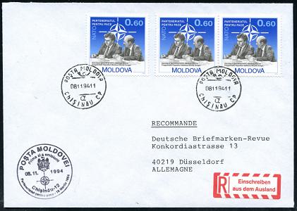 6192 | 20 € | 4000 Düsseldorf Sonderstempel : MOLDAWIEN 1994 (8.11.) 0,60 L. NATO = Präs. Snegur u. NATO Gen.-Sekr. Manfred Wörner (CDU), reine MeF (3x) , + ET-SSt, Ausl.-R-FDC., ohne RZ, nachträgl. in Düsseldorf gezettelt: R/Einschreiben/aus dem Ausland, selten! (Mi.128 MeF) | ![]() | |