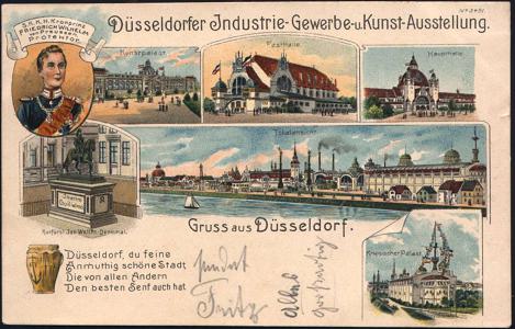6193 | 35 € | 4000 Düsseldorf Sonderstempel : DÜSSELDORF/ AUSSTELLUNG 1902 (2.8.) SSt auf Color-Litho-Ak.: Düsseldorfer Jndustrie-Gewerbe-u. Kunst-Ausstellung (6 Ansichten, dabei Kunstpalast) klar gest. Inl.-Karte n. Berlin (Bo.6 Ty.I = ohne UB) | ![]() ![]() | |
