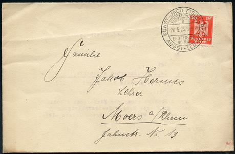 6196 | 20 € | 4000 Düsseldorf Sonderstempel : DÜSSELDORF 1/ e/ KUNST-JAGD-FISCHEREI/ AUSSTELLUNG 1925 (26.5.) HWSt glasklar auf Bedarfs-Bf.. (Bo.15 e) | ![]() | |