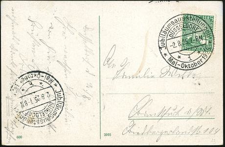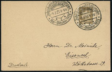6199 | 15 € | 4000 Düsseldorf Sonderstempel : DÜSSELDORF/ *f*/ Jubiläumsausstellungen/ Mai-Okt. 1925 (9.3.) HWSt der Jahntausend-Ausstellung mit UB "f" 2x klar auf Drs.-Karte (Bo.13 f) | ![]() | |