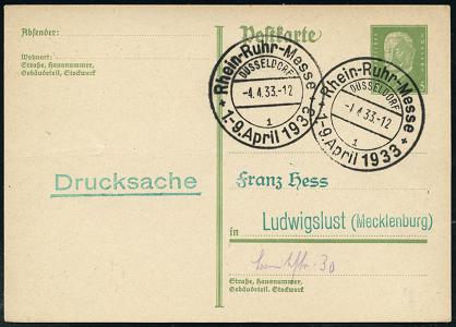 6207 | 20 € | 4000 Düsseldorf Sonderstempel : DÜSSELDORF/ 1/ Rhein-Ruhr-Messe/ 1.-9.April 1933 (4.4.) seltener SSt = Gastronomie-u. Hotel-Fachmesse , 2x klar auf Inl.-Karte (Bo.32) | ![]() | |