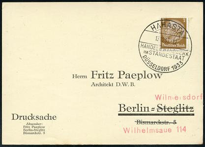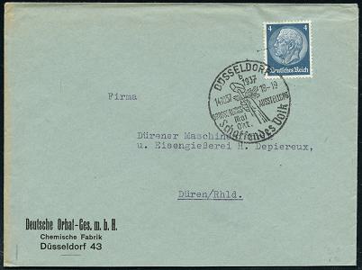 6212 | 15 € | 4000 Düsseldorf Sonderstempel : DÜSSELDORF/ b/ GROSSE REICHS-AUSSTELLUNG/ Schaffendes Volk 1937 (14.10.) SSt mit UB "b" (Hand mit Hammer) klar auf Firmen-Bf.: Deutsche Orbat-GmbH, Chemische Fabrik.. , vergl. Kat.Nr.6452 (Bo.42 b) | ![]() | |