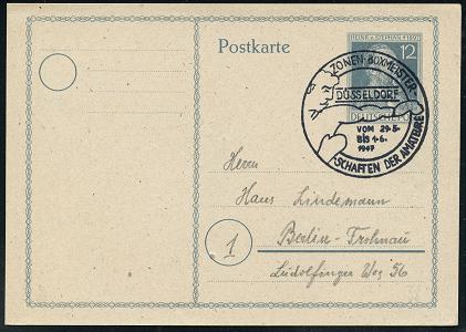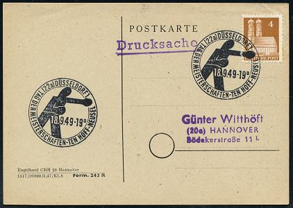 6215 | 12 € | 4000 Düsseldorf Sonderstempel : (22a) DÜSSELDORF 1/ TAG DER MEISTERSCHAFTEN TEN HOFF-NEUSEL 1949 (18.9.) SSt (Boxer-Piktogr.) klar gest. Inl.-Drs.-Karte (Bo.66) | ![]() | |