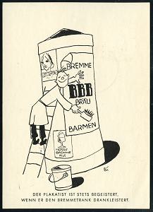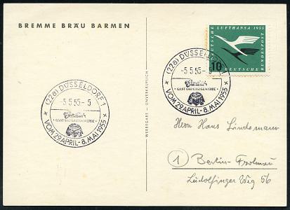 6224 | 20 € | 4000 Düsseldorf Sonderstempel : (22a) DÜSSELDORF 1/ GAST UND GASTGEWERBE 1955 (5.5.) SSt auf Bier-Reklame-Kt.: BREMME BRÄU BARMEN (Bo.104) | ![]() ![]() | |