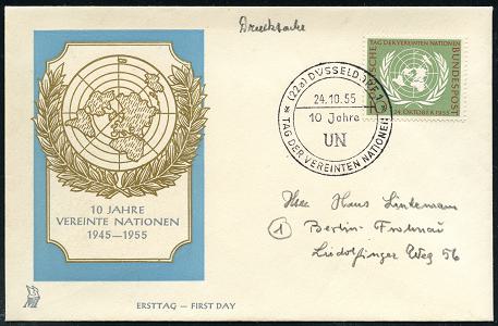 6225 | 16 € | 4000 Düsseldorf Sonderstempel : (22a) DÜSSELDORF 1/ 10 Jahre/ UN/ TAG DER VEREINTEN NATIONEN 1955 (24.10.) SSt auf EF 10 Pf. "Tag der UNO" (Mi.221 = FDC, + 36.- EUR) Inl.-FDC-SU (Bo.116) | ![]() | |