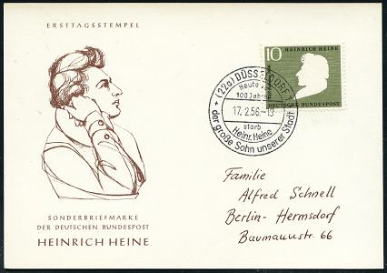 6226 | 20 € | 4000 Düsseldorf Sonderstempel : (22a) DÜSSELDORF 1/ Heute vor/ 100 Jahren/ starb Heinr.Heine.. 1955 (17.2.) SSt auf EF 10 Pf. Heine (Mi.229, EF, FDC + 20.-EUR) auf Ersttags-Sonder-Kt.! (Michealis Nr.22, + 40.-DM, 1991) Bedarf (Bo.118) | ![]() | |