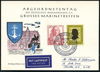 6227 | 18 € | 4000 Düsseldorf Sonderstempel : (22a) DÜSSELDORF 1/ Marinetreffen/ 70 Jahre Marinekamerdschaft/ Abgeordnetentag des DMB 1957 (8.6.) SSt (Anker-Wappen) auf passender Color-Sonder-Kt. = Michaelis unbekannt!, klar gest. Ausl.-Flp.-Karte (Bo.133) | ![]() | |