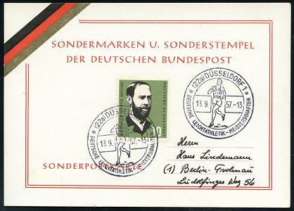 6228 | 16 € | 4000 Düsseldorf Sonderstempel : (22a) DÜSSELDORF 1/ DEUTSCHE LEICHTATHLETIK-MEISTERSCHAFTEN 1957 (18.8.) SSt = Langstrecken-Läufer (Läufer) 2x auf Inl.-Sonder-Karte (Bo.134) | ![]() | |