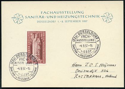6229 | 18 € | 4000 Düsseldorf Sonderstempel : (22a) DÜSSELDORF 1/ FACH-/ AUSST./ SANITÄR-U.HEIZUNGS-TECHNIK 1957 (4.9.) SSt 2x auf Sonder-Kt.! (= Michaelis unbekannt!) klar gest. Ausl.-Karte (Bo.135) | ![]() | |