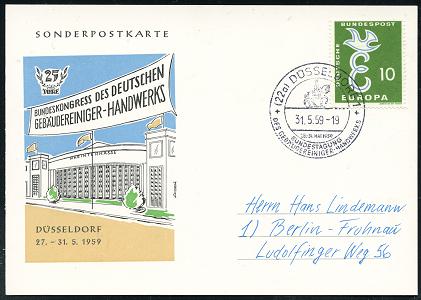 6230 | 18 € | 4000 Düsseldorf Sonderstempel : (22a) DÜSSELDORF 1/ BUNDESTAGUNG/ DES GEBÄUDEREINIGER-HANDWERKS 1959 (31.5.) SSt auf Color-SoKt.: RHEINTERRASSE (= Michaelis unbekannt!) seltene Inl.-Karte (Bo.155 , Finaltag) | ![]() | |