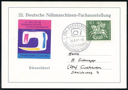 6231 | 15 € | 4000 Düsseldorf Sonderstempel : (22a) DÜSSELDORF 1/ 22.Deutsche/ Nähmaschinen-Ausstellung 1961 (26.6.) SSt (Silhouette einer Nähmschine) motivgl. Ausst.-Sonder-Kt. (Bo.172) | ![]() | |