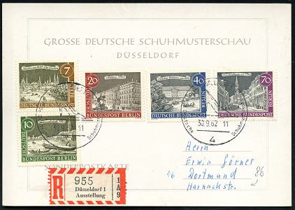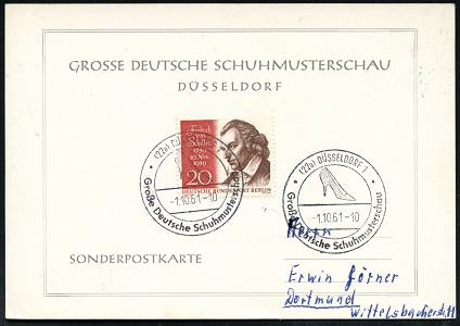 6232 | 16 € | 4000 Düsseldorf Sonderstempel : (22a) DÜSSELDORF 1/ Große Deutsche Schuhmusterschau 1961 (1.10.) SSt (Damenschuh) 2x auf Inl.-Sonder-Kt. (Bo.171) | ![]() | |