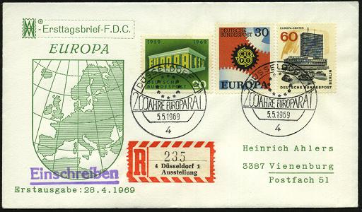 6243 | 20 € | 4000 Düsseldorf Sonderstempel : 4 DÜSSELDORF 1/ 20 JAHRE EUROPARAT 1969 (5.5.) SSt auf verschied. Europa-Marken CEPT , 2x + Sonder-RZ: 4 Düsseldorf 1/ A u s s t e l l u n g , klar gest. Inl.-R-Sonderumschlag (Bo.309) | ![]() | |