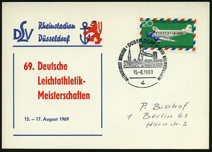 6244 | 15 € | 4000 Düsseldorf Sonderstempel : 4 DÜSSELDORF 1/ DEUTSCHE LEICHTATHLETIK-MEISTERSCHAFTEN 1969 (Aug.) SSt = Radschläger (vor Ortsbild) klar gest. Inl.-Sonder-Kt.! (Bo.316) | ![]() | |