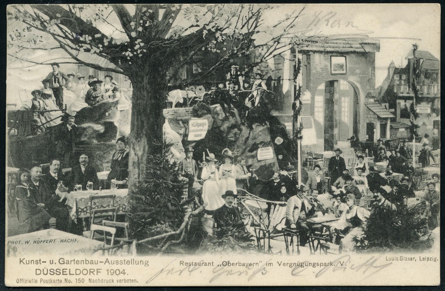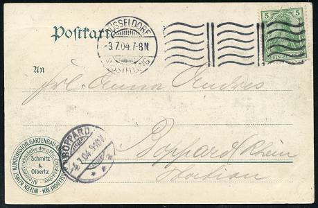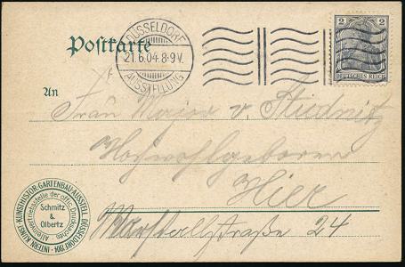6263 | 25 € | 4000 Düsseldorf Maschinen- u. Serienstempel : DÜSSELDORF/ AUSSTELLUNG 1904 (3.7.) Sonder-MaWellenSt. = Bickerdike klar auf EF 5 Pf. Germania, s/w.Foto-Sonder-Kt.: Kunst- u. Gartenbau-Ausstellung (Restaurant "Oberbayern") Bedarfs-Fern-Kt. n. Boppard, vs. AS. (Miller BW-9 / Nr.79) | ![]() ![]() | |