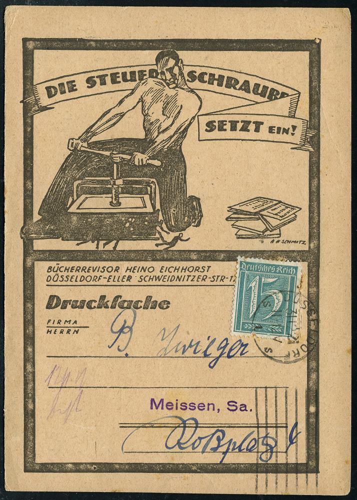 6268 | 25 € | 4000 Düsseldorf Maschinen- u. Serienstempel : DÜSSELDORF/ s1s 1921 (31.12.) Maschinen-Strich-Stpl (Universal) auf EF 15 Pf.Ziffer auf halber Reklame-Kt: DIE STEUERSCHARAUBE SETZT EIN! (Menschen werden ausgepreßt) kl.Rißchen, dekorativ u.aktuell! , Künstler-Signatur A N SCHMITZ, seltener Beleg! (Mi.160 EF) | ![]() | |