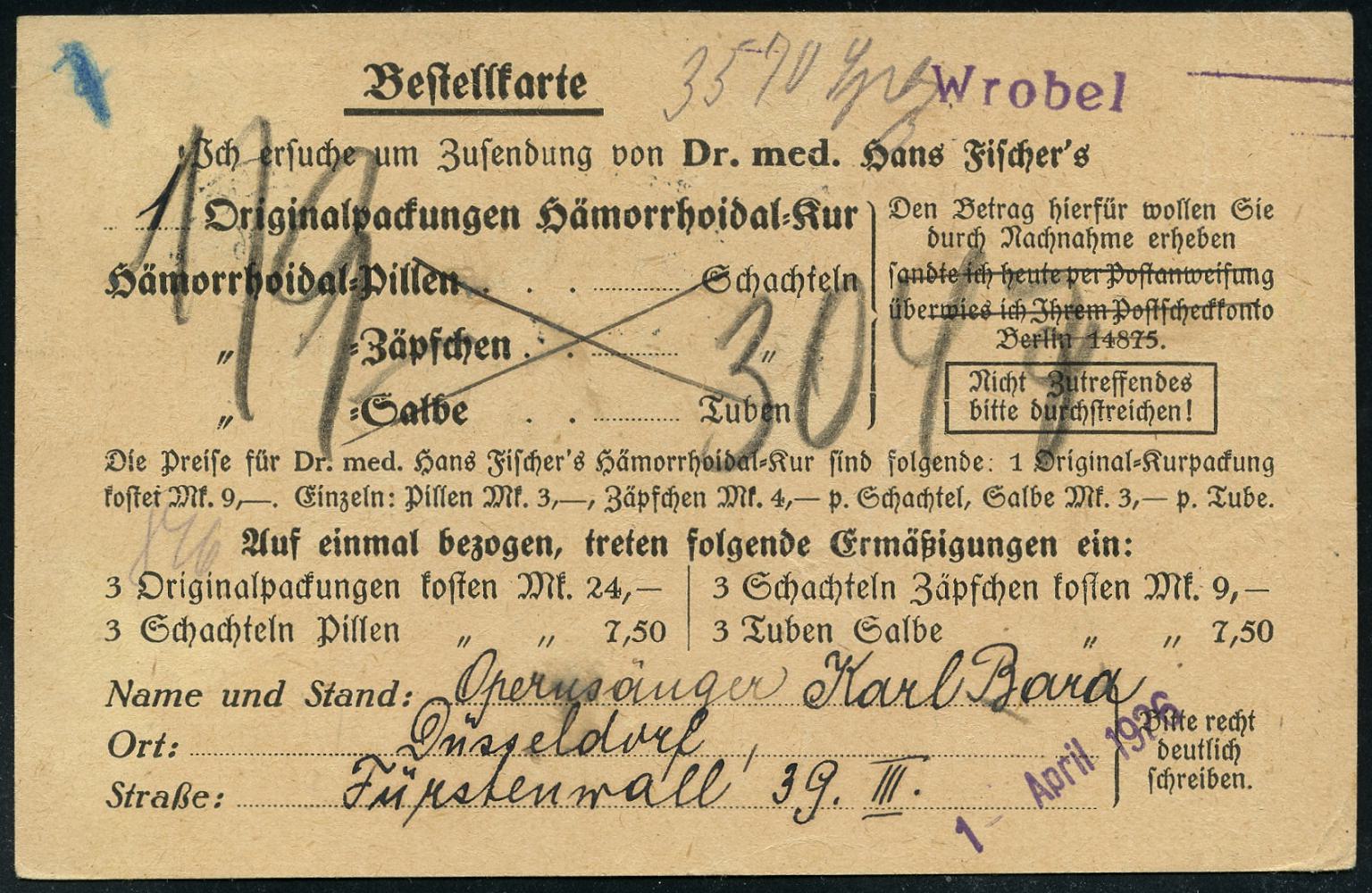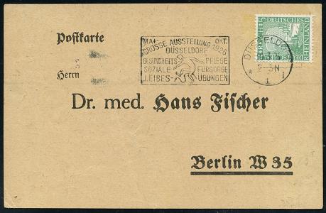 6272 | 20 € | 4000 Düsseldorf Maschinen- u. Serienstempel : DÜSSELDORF/ *1I/ GR.AUSSTELLUNG/ GESUNDHEITS PFLEGE/ SOZIAL.FÜRSORGE/ LEIBES-ÜBUNGEN 1926 (30.3.) MaWSt (Mann tritt auf Schlange) Pharmazie-Firmen-Antwort-Kt. Dr. med Hans Fischer (für Hämorrhoidal-Kur) EF 5 Pf. Jahrtausendfeier Rheinland (Bo.23 A I) | ![]() ![]() | |