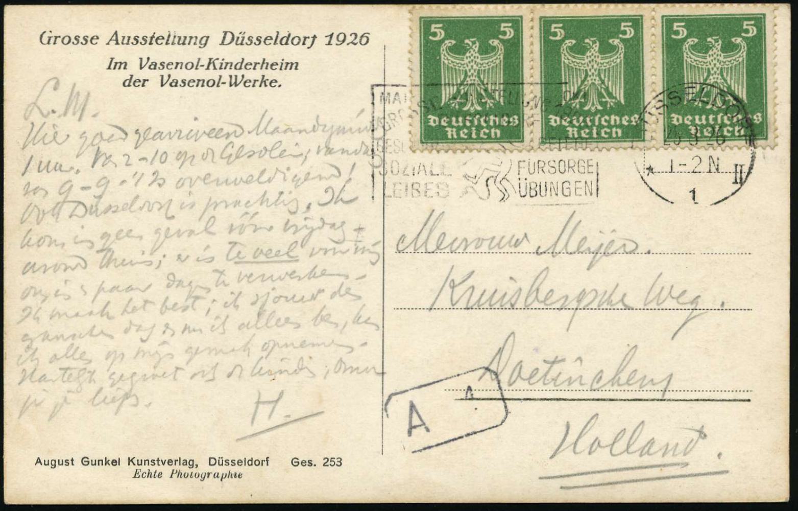 6277 | 30 € | 4000 Düsseldorf Maschinen- u. Serienstempel : DÜSSELDORF/ *1II/ GR.AUSSTELLUNG/ ..GESUNDHEITS-PFLEGE/ SOZIALE-FÜRSORGE.. 1926 (25.8.) MaWSt (Mann zertritt Schlange) auf s/w.-Ausstellungs-Foto-Ak.: Vasenol-Kinderheim der Vasenol-Werke , sehr seltene Bedarfs-Ausl.-Kt. n. Holland (Bo.23 A II) | ![]() ![]() | |