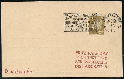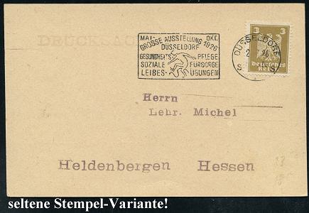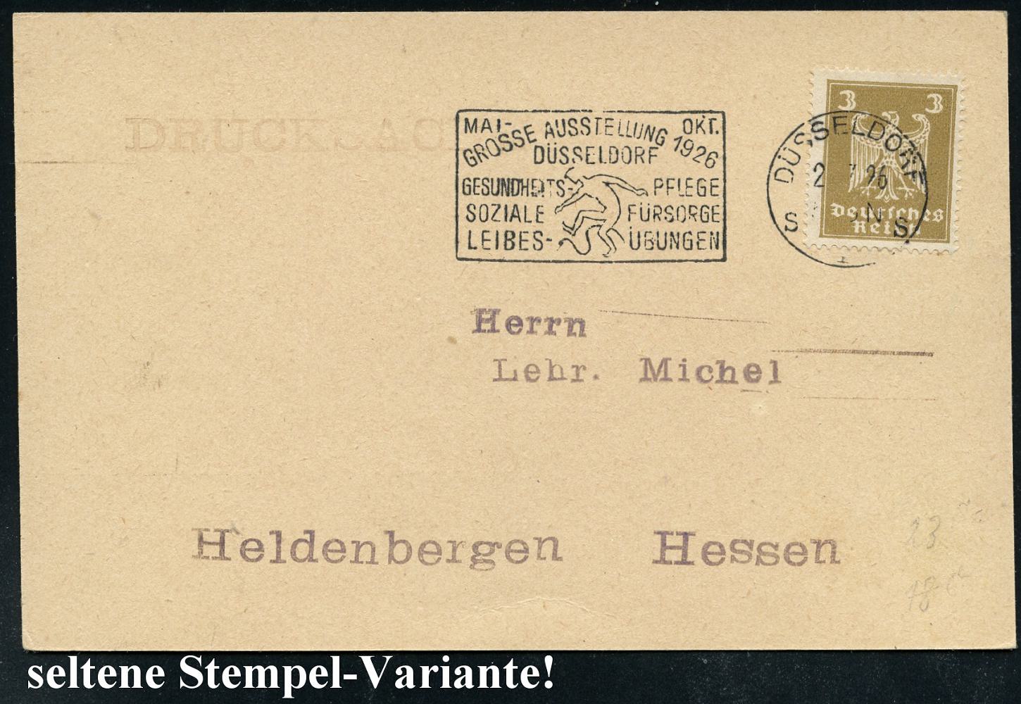 6278 | 18 € | 4000 Düsseldorf Maschinen- u. Serienstempel : DÜSSELDORF/ S1S/ GR.AUSSTELLUNG/ GESUNDHEITS-PFLEGE/ ..LEIBES-ÜBUNGEN 1926 (2.7.) seltener MaWSt (Mann zertritt Schlange) Inl.-Drs.-Karte (Bo.23 A III = seltene Type "S 1 S") | ![]() | |