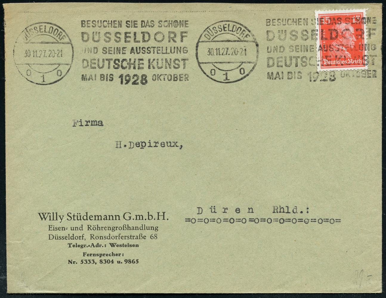 6279 | 18 € | 4000 Düsseldorf Maschinen- u. Serienstempel : DÜSSELDORF/ o1o/ BESUCHEN SIE DAS SCHÖNE/ DÜSSELDORF/ UND SEINE AUSSTELLUNG/ DEUTSCHE KUNST.. 1927 (30.11.) Band-MaWSt klar auf Firmen-Bf.: Willy Stüdemann GmbH, Eisen- u. Röhrengroßhandlung.. (Bo.29 Bd I) | ![]() | |