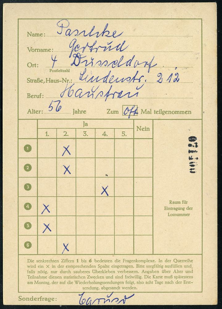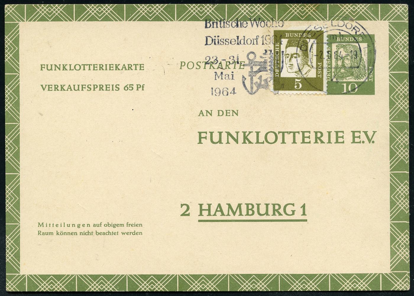 6304 | 18 € | 4000 Düsseldorf Maschinen- u. Serienstempel : 4 DÜSSELDORF 1/ mb/ Britische Woche,, 1964 (2.5.) MaWSt (Löwe mit Anker = Stadtwappen, vergl. Kat.Nr. 6303, 6305) auf seltener Funk-Lotterie-P 10 Pf. Dürer, Bedarf, seltene Verwendung! (Bo.213 A) | ![]() ![]() | |