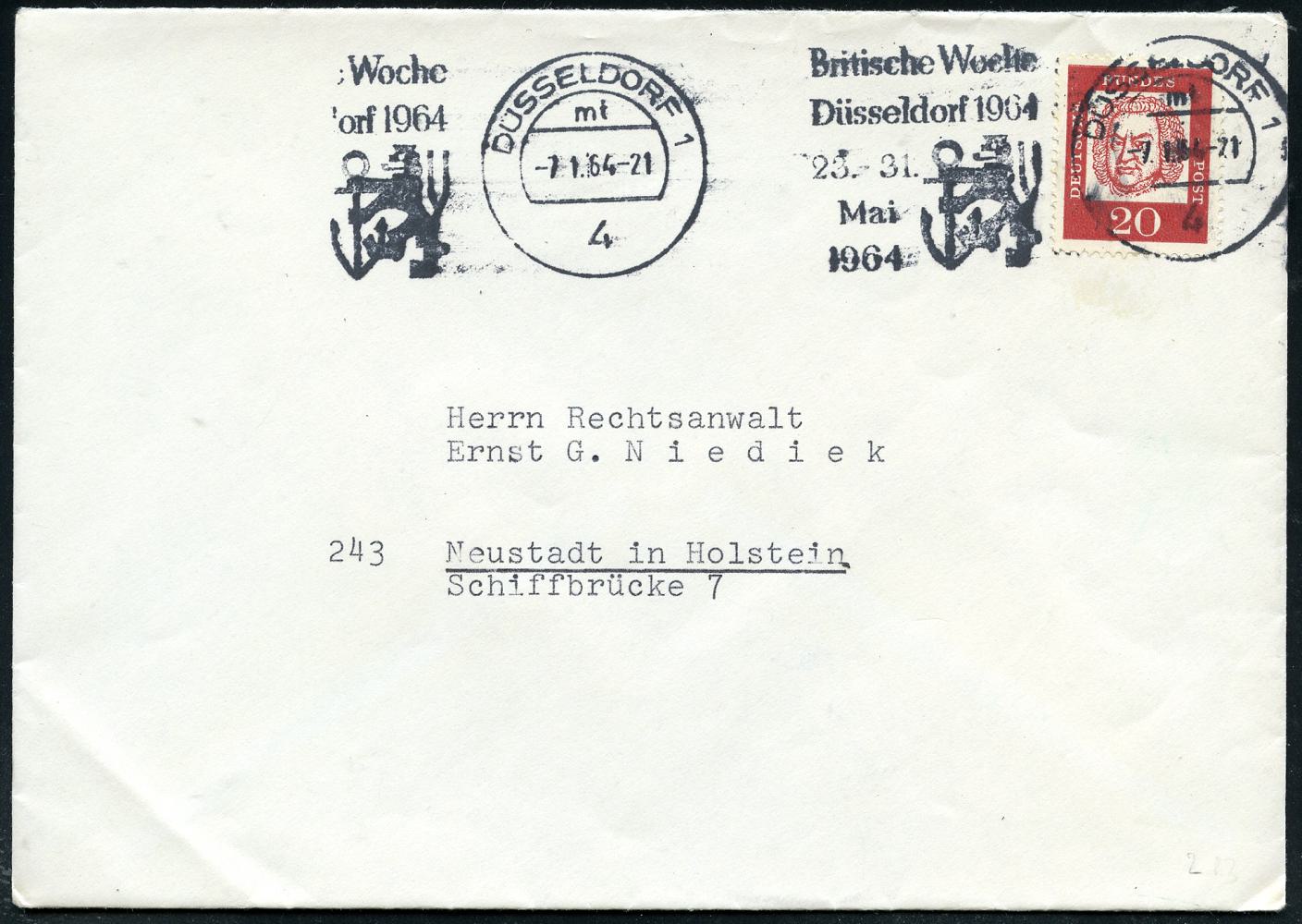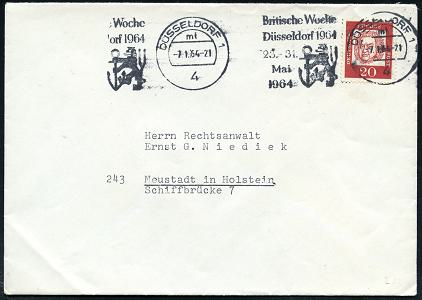 6305 | 12 € | 4000 Düsseldorf Maschinen- u. Serienstempel : 4 DÜSSELDORF 1/ mt/ Britische/ Woche/ ..23.-31./ Mai 1964 (7.1.) Band-MWSt (Löwe m.Anker) Fernbf. (Bo.213 Bd III) | ![]() | |