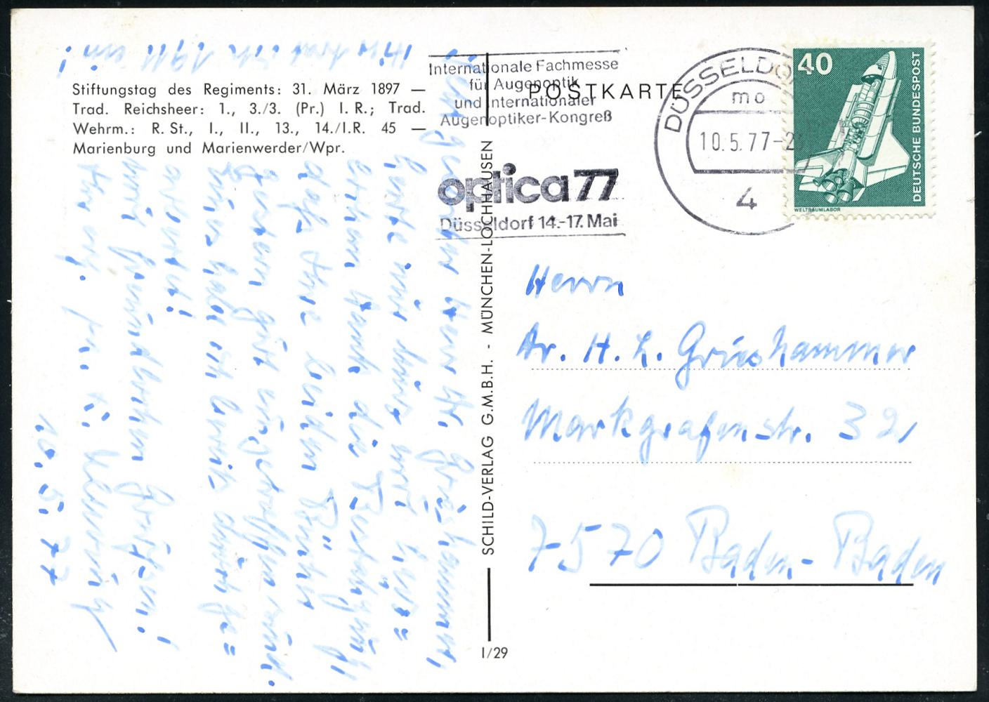 6317 | 8 € | 4000 Düsseldorf Maschinen- u. Serienstempel : 4 DÜSSELDORF 1/ mo/ Internat.Fachmesse/ für Augenoptik/ ..Augenoptiker-Kongreß/ optica 77 1977 (10.5.) MaWSt auf Color-Künstler-Ak.: Traditionsfahne Deutsch-Ordens-Inf.-Rgt. Nr.152 (Westpreußen) Bedarf | ![]() ![]() | |