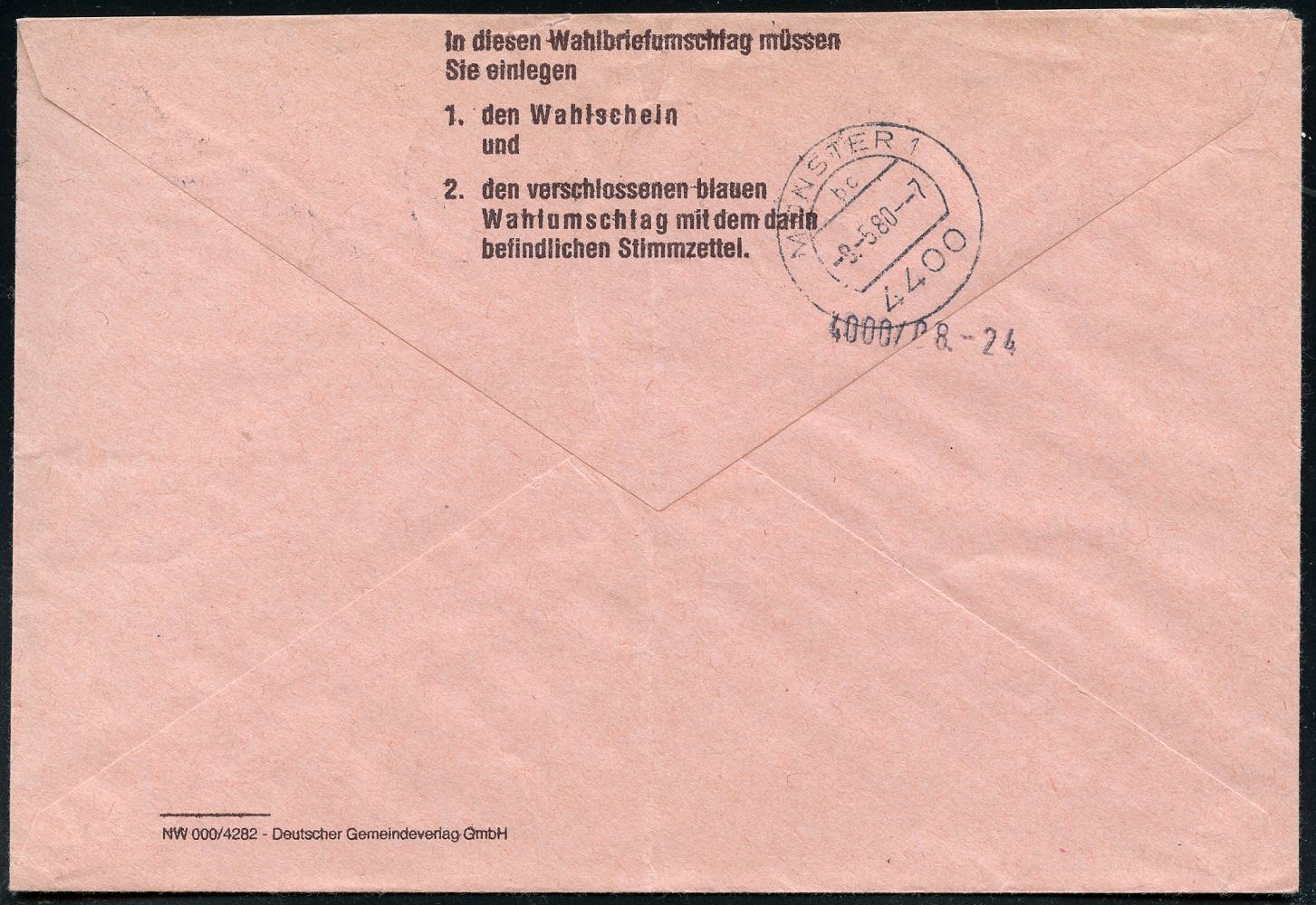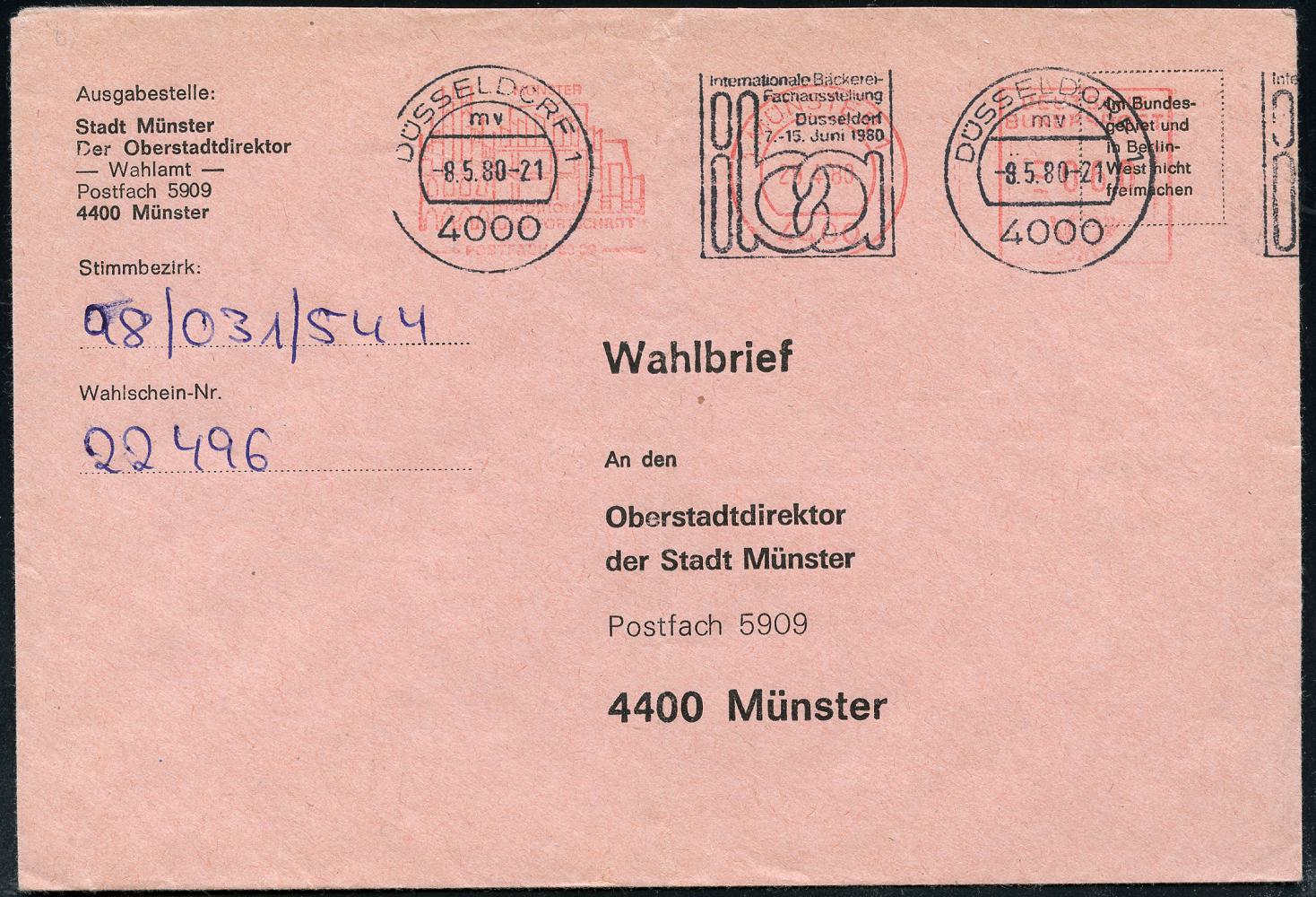 6322 | 15 € | 4000 Düsseldorf Maschinen- u. Serienstempel : 4000 DÜSSELDORF 1/ mv/ Internat.Bäckerei-/ Fachausstellung../ iba 1980 (8.5.) Band-MWSt + AFS 60 Pf. (Münster) vorausfrankierter, portofreier rosa "Wahlbrief" (für Briefwahl) rs. AS + Eil-AS von Münster! (Bo.612 Bd) | ![]() ![]() | |