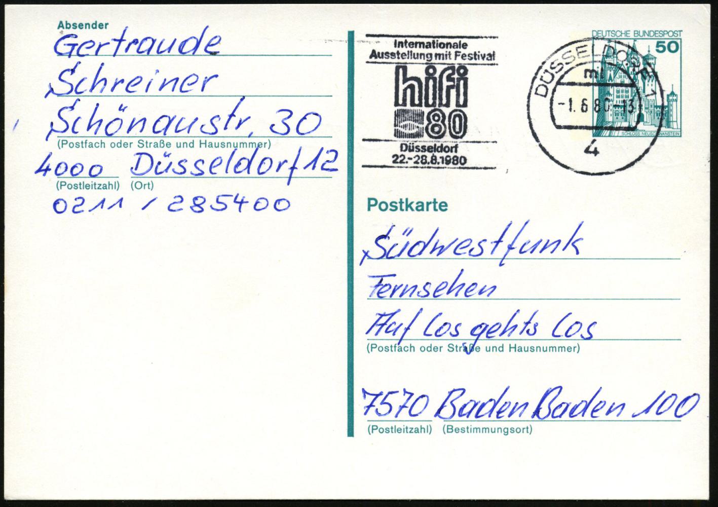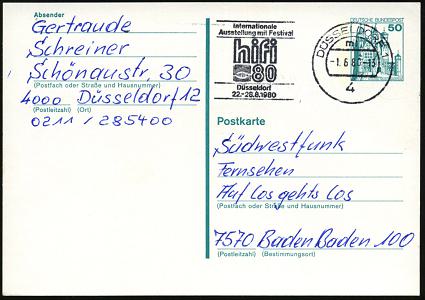 6323 | 5 € | 4000 Düsseldorf Maschinen- u. Serienstempel : 4 DÜSSELDORF 1/ ml/ Internat./ Ausstellung u.Festival/ h i f i/ 80 1980 MWSt (opt. Akustiksignal) Bedarf (Bo.613 A I) | ![]() | |