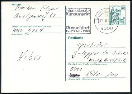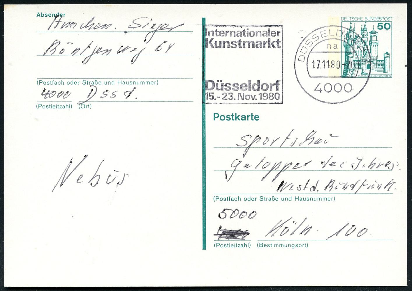 6325 | 5 € | 4000 Düsseldorf Maschinen- u. Serienstempel : 4000 DÜSSELDORF 1/ na/ Internat./ Kunstmarkt.. 1980 (Nov.) MaWSt . Bedarfs-Kt. | ![]() | |