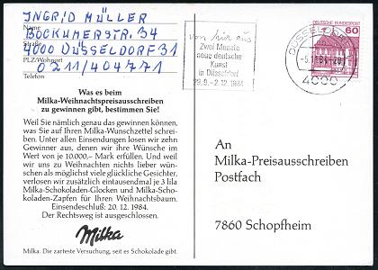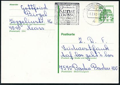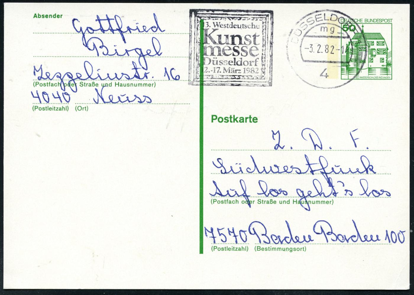 6326 | 5 € | 4000 Düsseldorf Maschinen- u. Serienstempel : 4 DÜSSELDORF 1/ mg/ 13.Westdt./ Kunst/ messe/ ..2.-17.März 1982 (3.2.) MaWSt (alter Bilder-Rahmen) Bedarfs-Kt. | ![]() | |