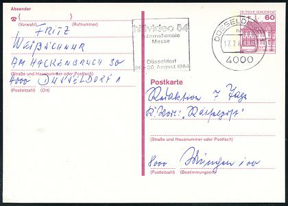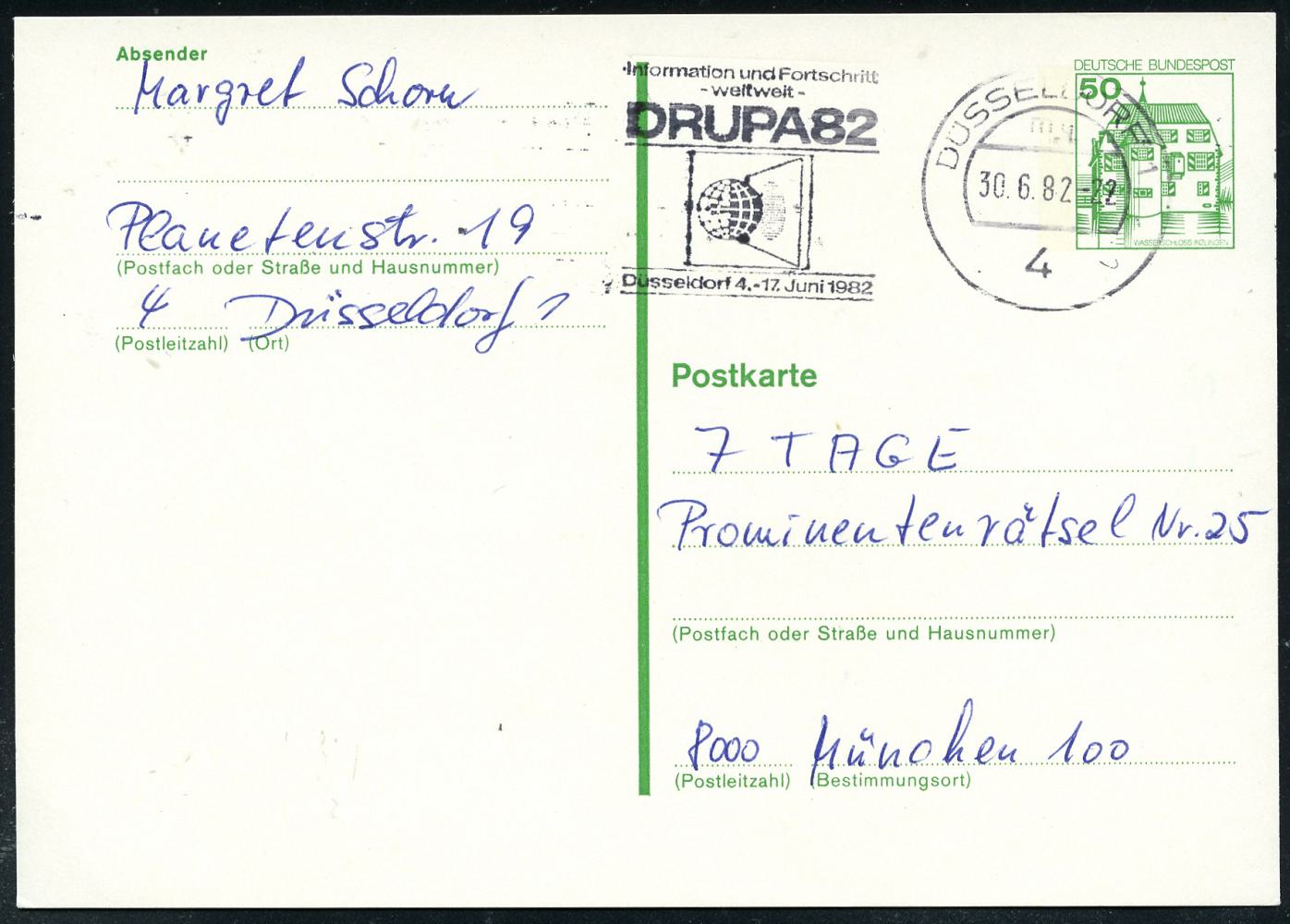 6327 | 5 € | 4000 Düsseldorf Maschinen- u. Serienstempel : 4 DÜSSELDORF 1/ mg/ ..DRUPA 82/ ..4.-17.Juni 1982 (30.6.) MWSt (Logo: Druck-Tampon als Globus) Bedarfs-Kt. | ![]() | |