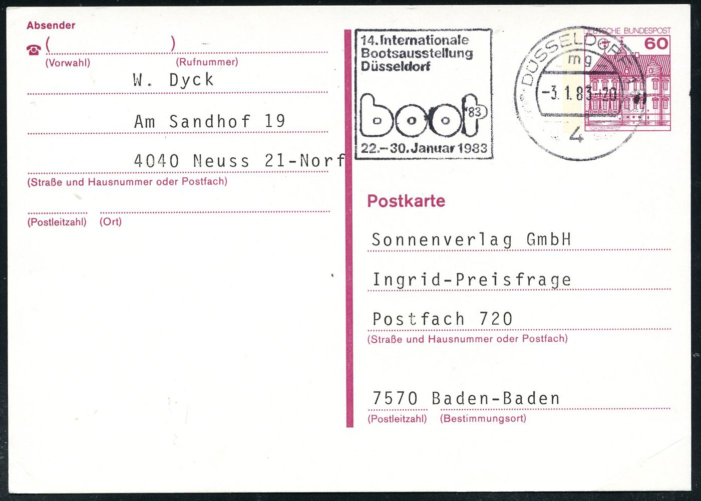 6328 | 5 € | 4000 Düsseldorf Maschinen- u. Serienstempel : 4 DÜSSELDORF 1/ mg/ 14.Int./ Bootsausstellung/ ..boot´83/ 22.-30.Jan. 1983 (Jan.) MWSt , Bedarfs-Kt. | ![]() | |