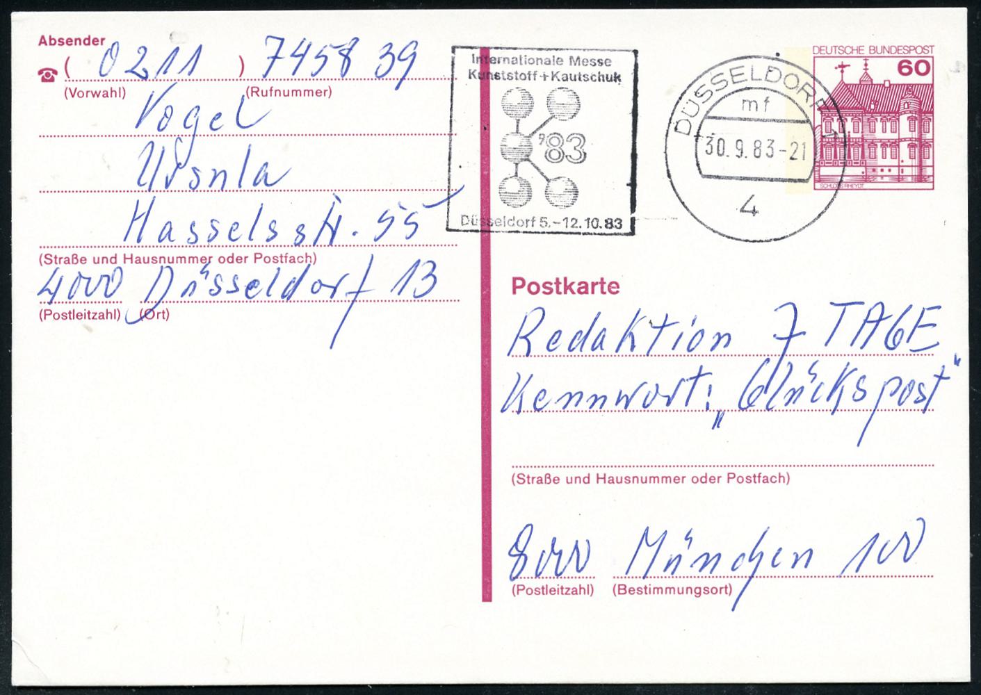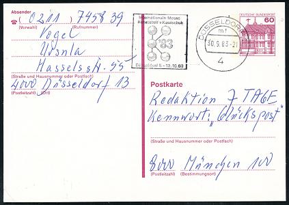 6329 | 5 € | 4000 Düsseldorf Maschinen- u. Serienstempel : 4 DÜSSELDORF 1/ mf/ Int.Messe/ Kunststoff+Kautschuk/ K´83 1983 (Sept.) MWSt ("K" als Molekül) Bedarfs-Kt. (Bo.715 A I) | ![]() | |