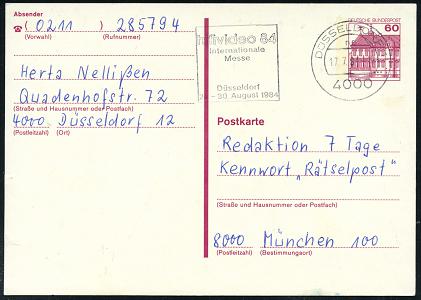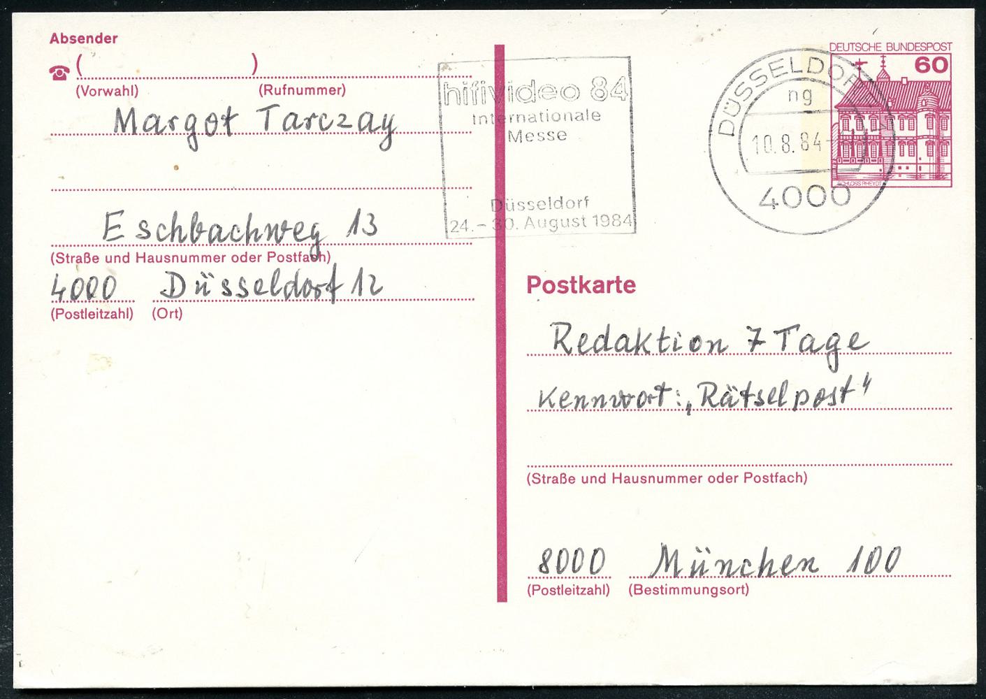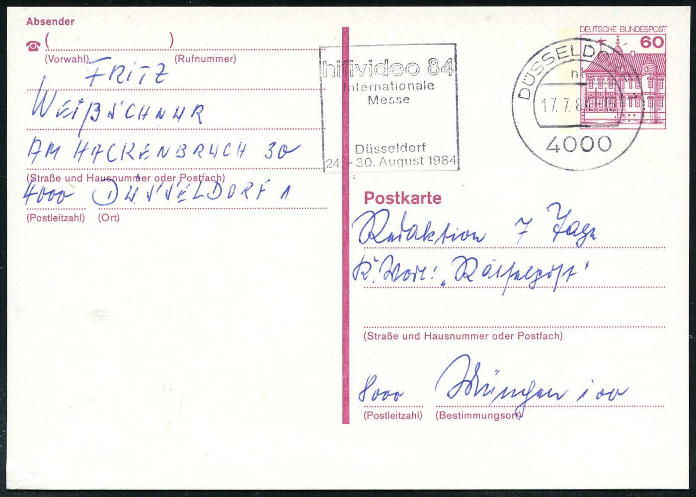 6330 | 14 € | 4000 Düsseldorf Maschinen- u. Serienstempel : 4 DÜSSELDORF 1/ ne #bzw.# ng #bzw.# nl/ hifivideo/ internat./ Messe/ 24.-30.Aug. 1984 3 verschied. MWSt , je auf Bedarfs-Kt., 3 Belege (Einzelausruf möglich: je 5.- EUR) | ![]() ![]() ![]() | |