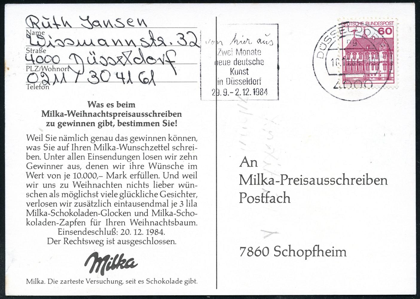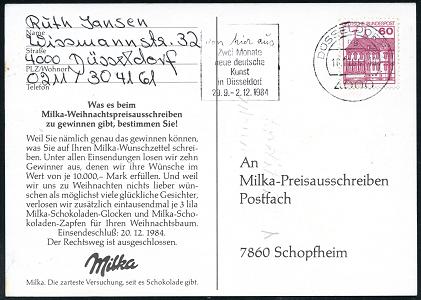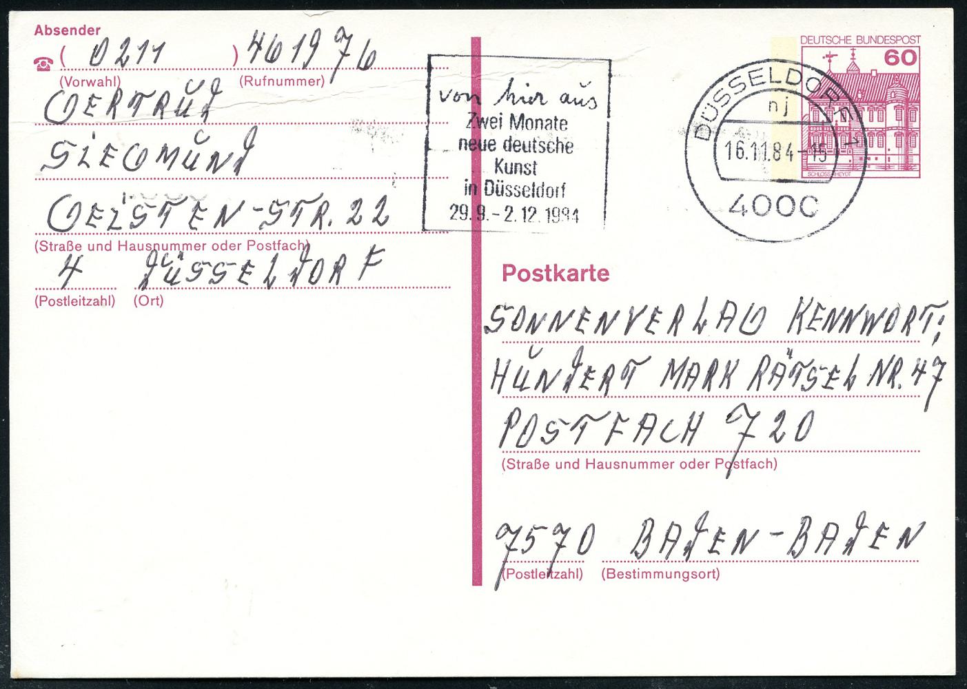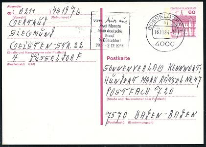 6331 | 14 € | 4000 Düsseldorf Maschinen- u. Serienstempel : 4000 DÜSSELDORF 1/ ng #bzw.# nj #bzw.# nn/ von hier aus/ Zwei Monate/ neue deutsche/ Kunst/ ..29.9.-2.12. 1984 3 verschied. MWSt = Beuys-Schriftzug "von hier aus" , je auf Bedarfs-Kt. (Einzelausruf möglich: je 5.- EUR) 3 Belege | ![]() ![]() ![]() | |