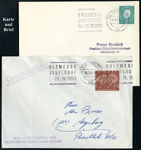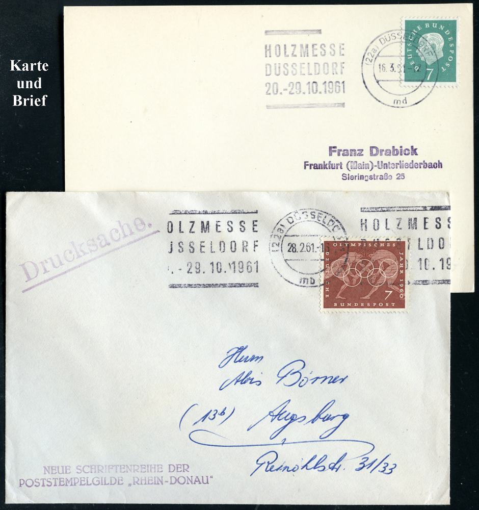 6301 | 18 € | 4000 Düsseldorf Maschinen- u. Serienstempel : (22a) DÜSSELDORF 1/ md #bzw.# mb/ HOLZMESSE/ DÜSSELDORF.. 1961 MaWSt u n d Band-MaWSt , je klar gest. auf Inl.-Karte u. Inl.-Bf. (Einzelverkauf möglich: je 11.- EUR), 2 Belege (Bo.169 A, Bd) | ![]() | |