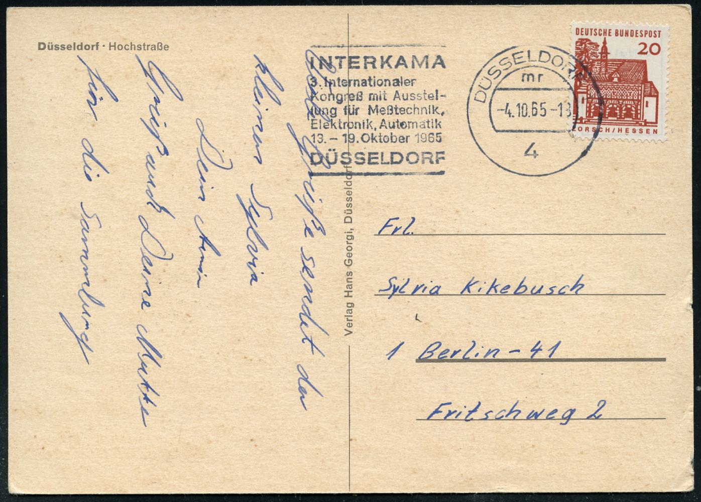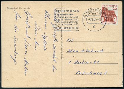 6306 | 12 € | 4000 Düsseldorf Maschinen- u. Serienstempel : 4 DÜSSELDORF 1/ mf/ INTERKAMA/ 3.Internat./ Kongrß mit Ausstel-/ lung für Meßtechnik,/ Elektronik,Automatik.. 1965 (4.10.) MaWSt (Halbstempel) klar auf Color-Foto-Ak.: Hochstraße bei Nacht, Bedarf (Bo.227 A) | ![]() ![]() | |