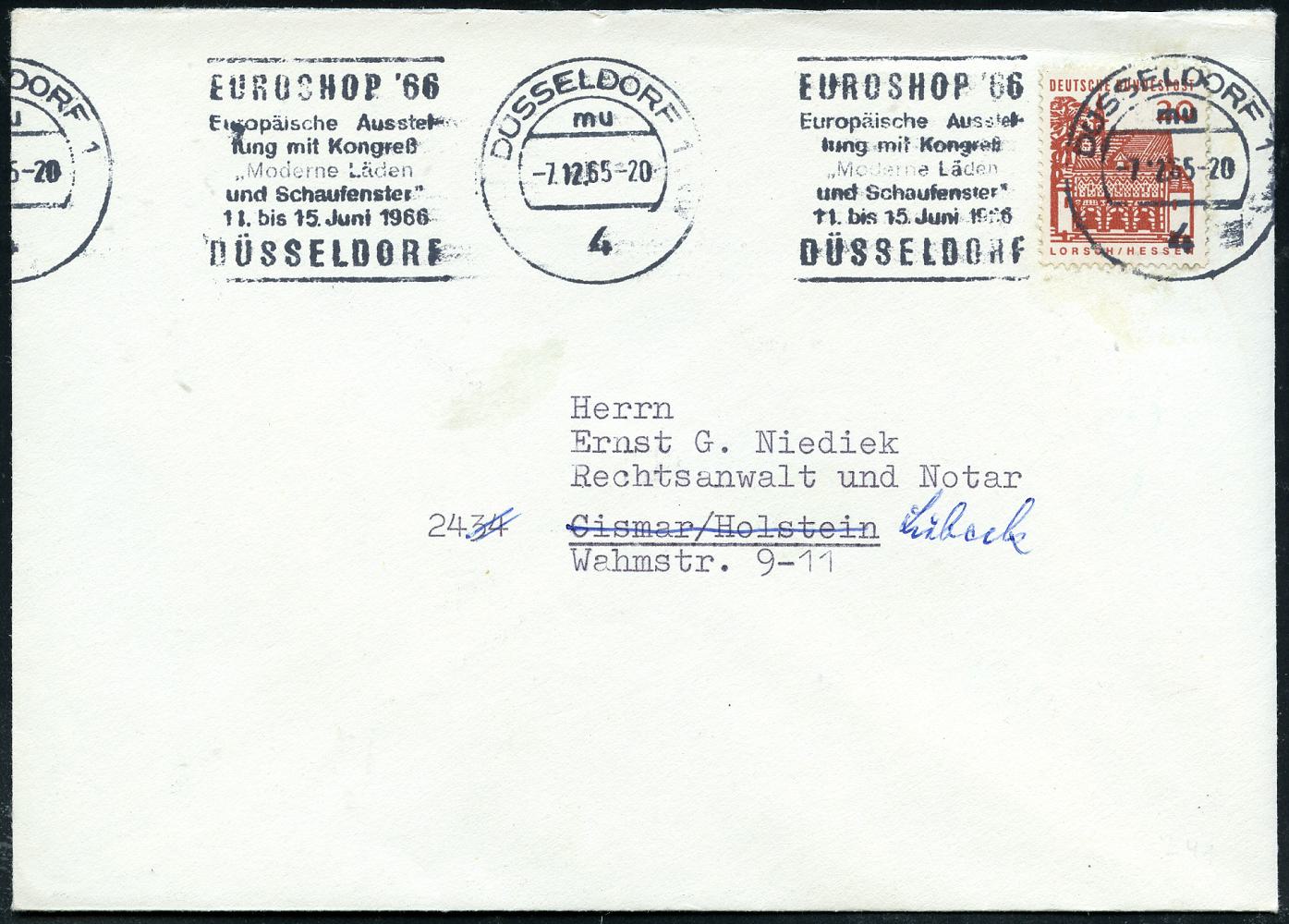 6308 | 8 € | 4000 Düsseldorf Maschinen- u. Serienstempel : 4 DÜSSELDORF 1/ mu/ EUROSHOP´66/ Europ.Ausstel-/ lung mit Kongreß/ "Moderne Läden/ u.Schaufenster".. 1965 (7.12.) Band-MaWSt auf Bedarfs-Bf. (Bo.241 Bd) | ![]() | |