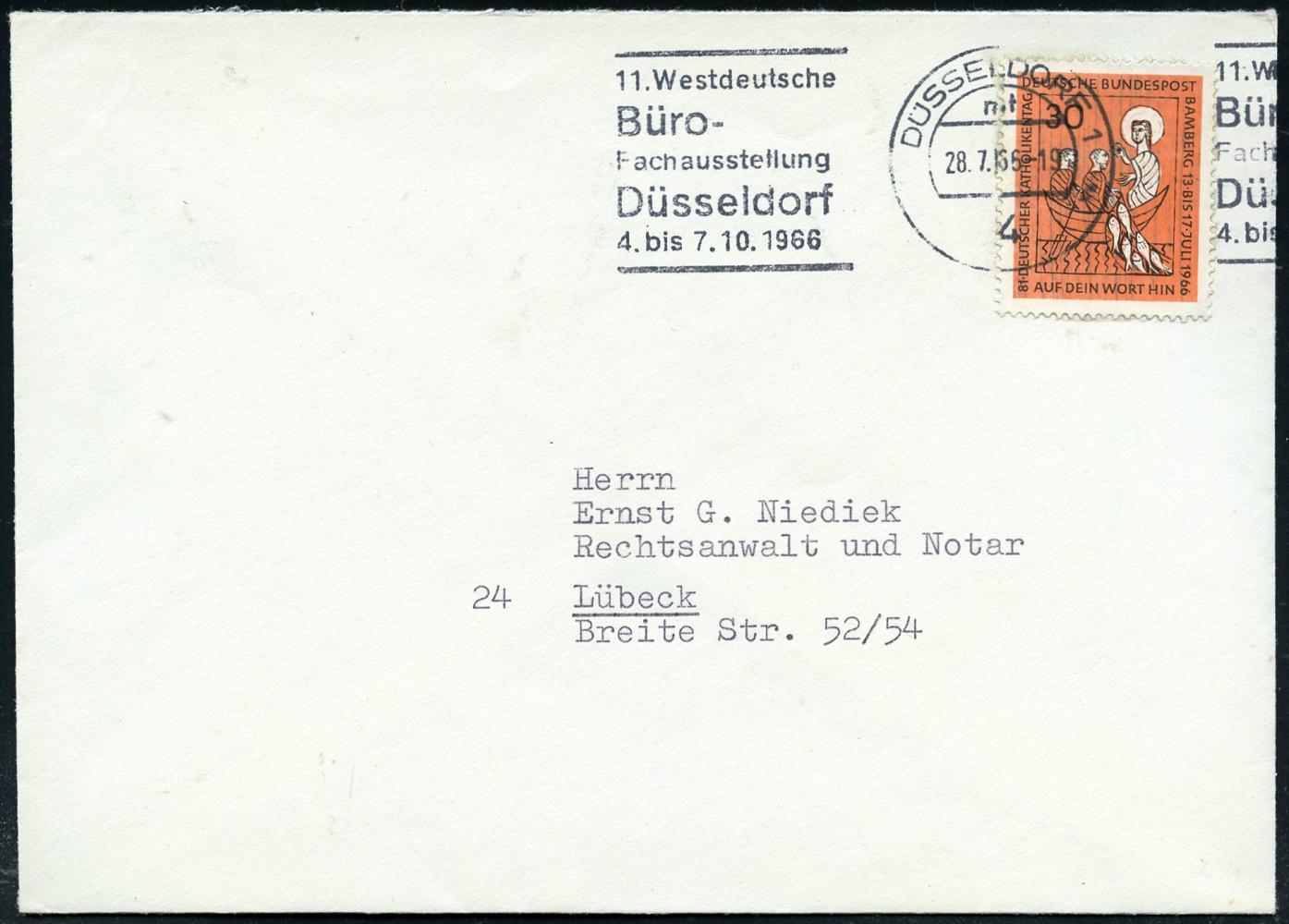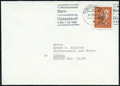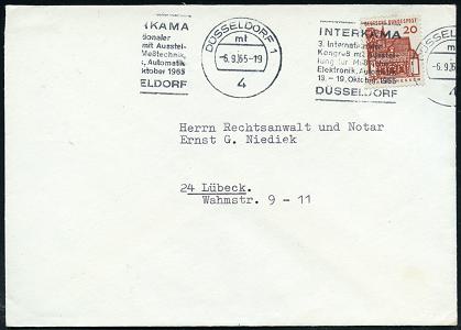 6310 | 8 € | 4000 Düsseldorf Maschinen- u. Serienstempel : 4 DÜSSELDORF 1/ mf/ 11.Westdeutsche/ Büro-/ Fachausstellung.. 1965 (28.7.) Band-MaWSt auf Bedarfs-Bf. (Bo.254 Bd) | ![]() | |