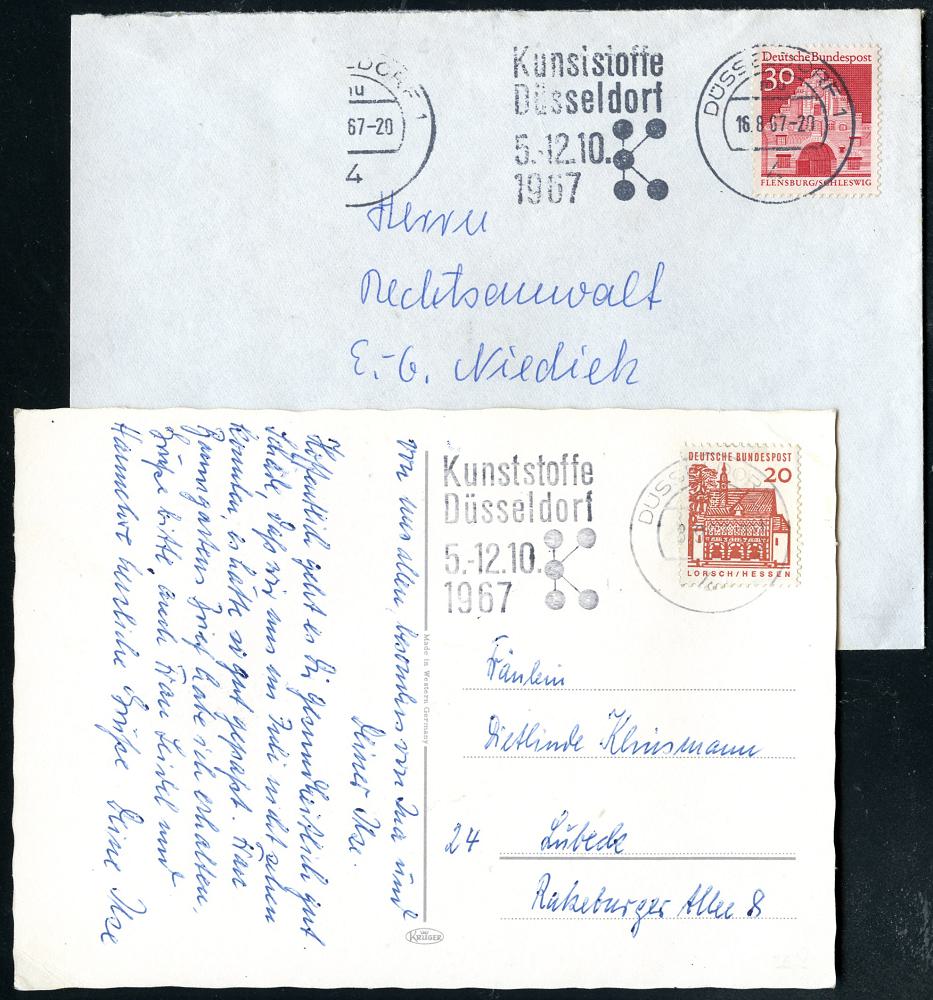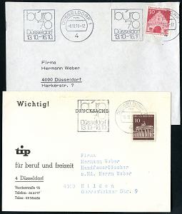 6311 | 14 € | 4000 Düsseldorf Maschinen- u. Serienstempel : 4 DÜSSELDORF 1/ mh #bzw.# mu/ Kunstoffe.. 1967 (Aug./Sept.) MaWSt bzw. Band-MaWSt ("K"-Logo) je auf Bedarfs-Kt. bzw. Bedarfs-Bf. (etw. verkürzt) 2 Belege (Bo.268 A. Bd) | ![]() | |